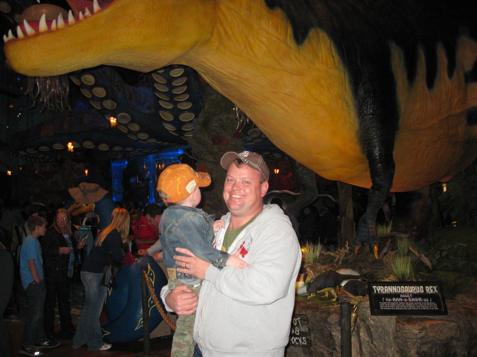 Wednesday we spent the day in the "big pool" as Thatcher calls it. They have stuff for all ages, a kiddie pool with slides, a gigantic water fort, a lazy river, and slides for adults and older kids. The slides were awesome! I got my workout going up and down those stairs- which is a good thing because the gym there was not good. Thatcher pretty much stuck to the kiddie pool and the fort. I tried to get him to go in the lazy river or the bigger pool and he was just not having it. We did get him to go down the slide if you threw him down it. Wednesday we hit the outlet mall, which is gigantic, and there were some great after Christmas deals. Later that night we went to a restaurant called T-Rex which has all these mechanical dinosaurs everywhere. Thatcher was scared of the T-Rex and wanted nothing to do with it. Although if you ask him now where he wants to eat he says T-Rex.